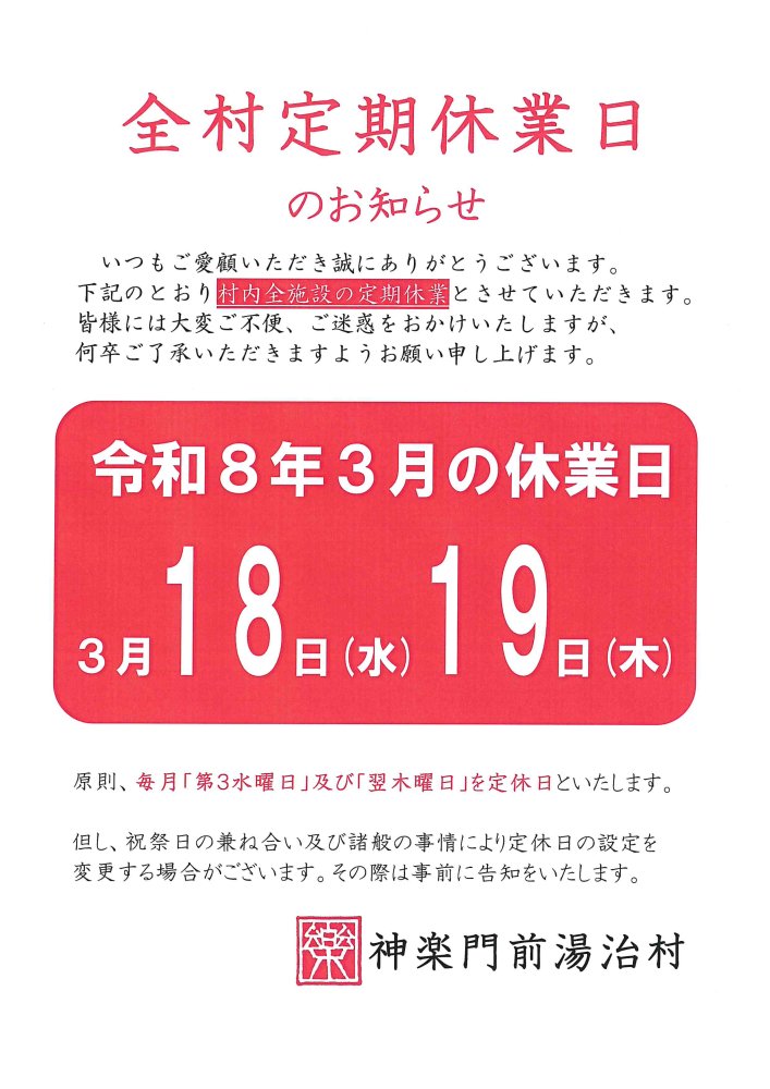 【3月18日・19日】全村定期休業のお知らせ